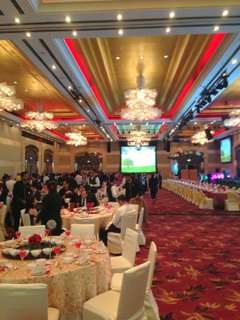 終わりましたよ~~。娘は大変だったのにね。。。親はそろって、こんなことしてました。。。相変わらず600超の招待客。1番目の写真の、右側奥にずらすらっと並んだ席は大臣だの大臣だの大臣だのの、お金持ち用のVVVIP席。閣僚会議でも始まるかと思いましたわ2枚目は毎年感心するほど訓練された、プロのダンサーたち。3枚目は、主催の大金持ちの奥様です。この奥方は、どんな時も、どんな席も、いつもこのパンツスーツ。決してきらびやかなドレスや、民族衣装など着ない。志高くて、潔く、大好きな方です。典型的中華のテーブルセッティングと前菜盛り合わせ。恐ろしく人口着色料たっぷりの赤いジュース付き珍しく、ふかひれスープではなく、チキンとアバロンのスープ。左上の白いのが、卵でなくって、アワビねガルッパの蒸し物。半身だけ出てきたわけじゃなくってね係りのものが、食べやすく分けてくれた後。そして、この辺りから始まりますよ~~~。恐怖の一気呑み。この、真ん中のおっさんね。主催者です。後ろに書いてあるTan Sri Datoというのが、このおっさんの肩書きです。マレーシアではこの称号は、伯爵とかそういうことを意味します。何億も学校に寄付したり、100を超える学校寄贈したりする大金持ちの足長おじさん。こうやって、大きなパーティーには必ず今でも恩師の先生を呼んで(そう。これ漫才やってるわけじゃない)お礼を述べる、義理堅い律儀なおっさん。でも一気呑みの主犯ね。すごいんですよ、この人はね。60テーブル以上、全部廻って、顔ぶれによってはほとんど一気で呑んでしまうんだから。勿論、ワタシたちのテーブルは、メンツ濃いですから有無を言わさず一気です。男子はマッカランのロック、グラスなみなみ。女子はワインやっぱりグラスなみなみおっさん直々に注いで下さいますんで~~全員、きっちり呑まされましたから。空っぽです。もう、どど~~っと全員酔い始めまして~~~あっちこっち、引っ張られては、写真撮影。我々、サーは紋付袴、アイールさん留袖。つう、完璧コスプレ感覚の、娘の結婚式ですか状態でしたから知らない人たちにまで呼ばれて、写されまくりましたとさ。仲良しの友達が、「写真1枚100リンギ(マレーシアの通貨)徴収しようか。」と冗談言ったほど。そんな間に、食べ損ないかけたワタシの大好きな、野菜のディッシュ。と、蓮の葉で巻いたおこわ。既にこの辺り、11時過ぎてましたから早く帰りたいスタッフたち、片付けるの早い早いおこわ、お持ち帰りしたかったのに、気付いたら片付けられてましたふと考えてみたら人のカメラにはイッパイ納まってるけど多分つか絶対、誰一人ワタシたちに送ってくれるわけないのでサーと二人の写真がない。そんなワケで、家に帰ってから娘に撮ってもらったど酔っ払いの二人の写真~~~