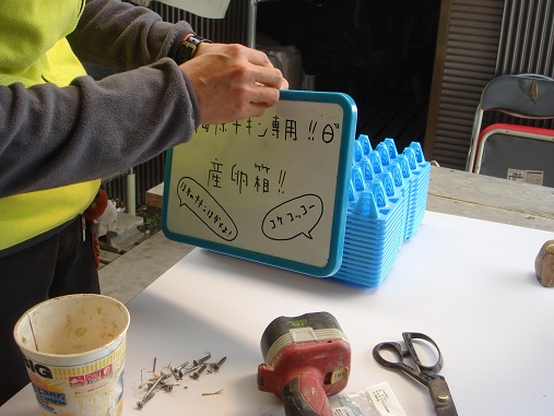 昨日。折角もったいぶってネタを隠しといたのに麦わらに先に写真公開されてしまいましたね。ノヤロ~って怒ることはないですよ。彼らは彼らの感性と時間で生きているのですから。てな次第で昨日日曜日に何があったのかはバレバレですが、シレっとレポートします。昨日、日曜日。土曜日にお隣黒潮町に来ていた梅原オーナーがニワトリノニワ・チキンを見物にいらっしゃる予定となっていた。ので朝からTKTAに頼んで、あ、テキトーA子に頼んで急きょ梅原オーナー専用のチキンにネームプレートを。更に麦わらに頼んで梅原オーナーチキンさん専用産卵箱を取ってつけたように準備してもらった。前日に準備するとネームプレートが外れたり産卵箱表記のホワイトボードがフンまみれになったりと、大変なのだ。ま、ともかく梅原オーナーを迎え入れる準備にぬかるみはないゼ・・・11時過ぎに梅原オーナーがいらっした。しかし鶏舎のお外で見物されるばかりで一向に中に入ろうとはしない。あのぉ・・・・オーナーですからオーナーらしく振舞って頂かないとこちらも準備した手前というものがある訳で。15分ほどこの前梅原デザイン事務所で話した卵の加工商品の話と前日決まった新たな企画の話をしたら、帰ろうかと。そんな訳にはイカヌ。もう一つ準備してた麦わらの入れるコーヒーを飲んでもらわねばならぬ、と呼びとめた。一生懸命コーヒーを入れる麦わら。アシスタント・ギャルが真剣に見てるぞ。あ、肝心な梅原さんが柱の陰に隠れてるか。ま、いいか。ギャルが写れば。そんな訳にはイカねーか。はい。梅原さんが眼鏡外してみてるのは麦わらの写真家時代の作品。画家のパンフレット。麦わらが気に入った若い画家で、写真家としての報酬は要らぬと断ったそうだ。やるじゃん。とても良い作品なので機会があればその内紹介しますね。ともかく、正午丁度にちっこい軽自動車の後部座席に乗って梅原オーナーは帰ってイカレタ。いや、実はそれから高知県最西部の柏島に行ったらしい。その超ローカルにも梅原さんしか頼りにできぬ人がいるのだ。午後遅く。麦わらの家族が見学に来てくれた。5歳の麦わらジュニアは父さんとそっくり。家族の幸せを祈る。そういや、前日の懇親会の席で。かなり酔った四万十ドラマの畦地さんの何気ない一言に僕は畦地さんの心の葛藤を知った。その言葉は伏せておくが、気持ちはとても良く分かった。梅原さんと師弟関係で20年来の付き合いがある畦地さんを差し置いて僕はあの番組であそこに映っていて良かったのかな・・・梅原さんに紹介してもらって以来、兄貴分として頼りにしてただけに悩んでしまう。↓↓クリックして応援