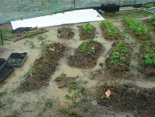 さーて、今日は昼間っからブログの更新しちゃうぜ。ま、そろそろ仕事の引き継ぎが終わってきており無事独り立ちしつつあるということだ。めでたしめでたし。じゃ、ともかく昨日とおとといのレポート。おとといは薄曇りの朝。解放したての運動場は瞬く間に葉っぱが食い尽くされつつある。でも奥の方はまだまだ大丈夫。そーいや、おとといは京風な一日だった。おいでやすだった。仙台かどこかでトラックが横転してたものな。ニワトリノニワは事務所の屋根は昨年末に断熱材施工をした際にちゃんとはり直したのでちょっとの風くらいへっちゃらってなもんだ。マイッタカ!だが梱包資材などを入れてる倉庫は最も金がない時にヤスブシンな上にテキトーに仕上げてあるため風が吹くたんびにバタバタ、ギシギシと悲鳴を上げる。な、訳でその日は朝から台風並みの西風が吹いていたと思ってたら昼ごろにバッタンバッタンすんごい音に変化した。うちは西風に弱いのだ。カンベンしてくれや。心配になって倉庫に入り、中から天井を眺めると暗く閉ざされているべき場所からパックリと青空が見える。本当は現実逃避してなかったことにしたいところだがそういう訳にもいかぬ。恐る恐るハシゴを立てて登ってみると・・・や、やっぱりそういうことでしたか。急いで傘釘とトンカチを持ってきて必要以上にトントン、カンカンと打ちつけておいた。バカヤローめが。しかし今年の台風が心配だ・・・・それまでにちゃんと屋根作らねばな。屋根の上で下界を見下ろす。前日の大雨で田んぼにたっぷりと水が入っている。今年はいい米とれるといいねぇ。とか眼を細めてる場合じゃなく、屋根の上は京風な強風が吹き荒れぶっ飛ばされそうになった。あぶねーゼ。はい、昨日。A子に畑の看板を作ってもらった。いもって書いてあるけどジャガイモだ。サツマイモかジャガイモかくらいは書いて欲しいもんだ、と思ったがA子に頼んだ僕が誤っていると一瞬で諦めた。で、でも、いもって・・・・大雨降ったお蔭でそのジャガイモがたくさん芽を出していた。エンドーさんもニョロッと。かぼちゃがわっさーっとはえてきた。そろそろ定植だな。昨日は行きつけのホームセンター、コーナンで夏野菜の苗をたくさん買ってきて植えた。この畝も何故か途中からくの字に曲がっていたのだが、もう今更ツッコむのも飽きたので特に写真はなしだ。いや、A子のテキトーっぷりはホンモノだ。きっとテキトー遺伝子が組み込まれた人類初の生き物かも知れない。驚異だ。夕暮れだ。↓↓クリックして応援
