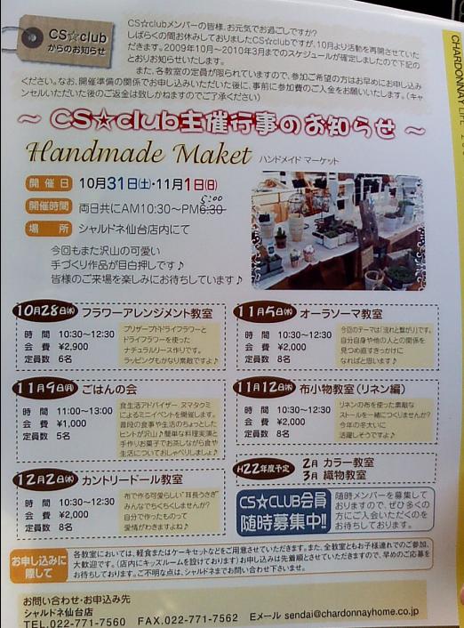 ハンドメイドマーケットのお知らせです!!シャルドネ仙台店で10月31日と11月1日に開催します。お近くのかたは是非いらしてくださ~い