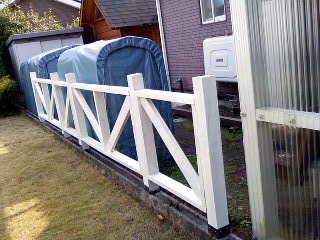 家を新築した時に、自作したウッドデッキも安い材料を使ったため10年ほどで傷んできました(涙)そんなデッキを昨年解体し、元気な材料はフレームや花台など様々な第二の人生?を歩んでまーすデッキのフェンスはまだまだそのままでも元気でした。そのフェンスもしばらく、ガレージの隅で眠っていましたが、白いペンキを塗ってこんな形で再スタートを切っています!ブロックへの固定は振動ドリルで穴をあけ、コンクリート用アンカーを打ち込んでステンレス木ねじで固定しています