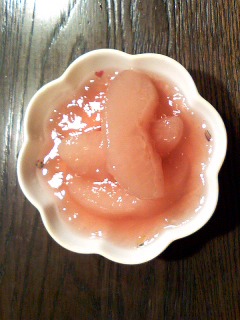 先々週末に、ご近所から甘くないよ~って言われて、梨をいただきました(二十世紀)。甘くないなら煮てみようかなー でも洋梨ではないけどおいしく出来るのかなーって思っいながらもネットで検索したら、ありましたありました。材料(6人分)梨...3個グラニュー糖...120gハチミツ...大さじ5レモン汁...1個分バニラエッセンス赤ワイン...150ml水...300ml 作り方鍋に、グラニュー糖、ハチミツ、レモン汁、バニラエッセンス、赤ワイン、水を入れて強火にかける。煮立ったら皮を剥いて八等分に切った梨を入れ、クッキングシートを丸く切っての落とし蓋をして、煮汁が紙蓋に当たり全体に広がる火加減で、10~15分煮る。冷まして冷蔵庫で冷やす。煮汁は温かいうちにゼラチンを適量入れて、別容器で冷やしてクラッシュゼリーとしてコンポートにかけたり、別のおやつとして食べる!! 煮汁で作ったクラッシュゼリーをかけておいしくいただきました!!ご近所のお友達にも大評判!!!夏に桃でコンポートを作ったけどそれよりおいしいかも