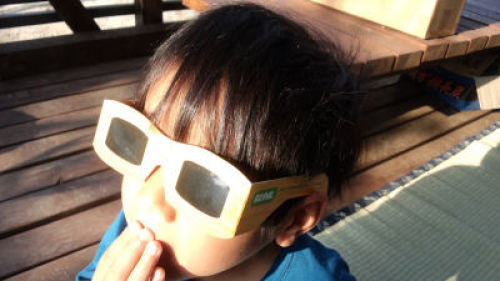 昨日は金環日食でしたね。我が家でも家族で楽しみました。予報では曇りでしたが朝のうちは雲が切れてくれて、絶好の観察日よりだったのではないでしょうか。坊主たちも興味津々。写真は5歳の次男マー坊。ピンホールでも観察してみようと手頃な段ボール箱に投影してみたのですが、ちっちゃくて見づらい。代わりに庭木の木漏れ日がキレイに丸く映りました。せっかくだからカメラ撮影を試みてみました。デジカメをスタンバイしておらず、ケータイのカメラです。ブレブレですがとりあえずそれっぽく撮れてます。順番は左上→右上→左下→右下。ケータイのカメラレンズに観察眼鏡をあてて撮りました。手持ちのままデジタルズーム使用、低画質モードなのでこのくらいが限界かな。特に天文マニアというわけでもないのですが、世紀の天体ショー堪能いたしました♪