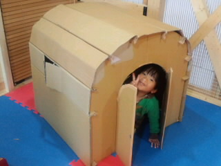 昨年夏に引っ越した後、いろいろと必要になり家具や収納用品を買いました。そうすると付き物なのが「大きめの段ボール箱」半分以上は資源物収集に出したのですが、中でも丈夫そうなものはとっておきました。せっかく住まいも広くなったことだし、段ボール工作ででかいものを作りたかったんですよね。とりあえず大きめの段ボール箱にドア部分を空けて、簡単なおうちを作ったりしてたんですがそれだと段ボールの大きさ次第でサイズは限られちゃう。せいぜい子供が一人入れるくらい。せめて二人一緒に入れるサイズが欲しいけど、かといってそんなに大きな段ボールなんてうちにはないし。で、いろいろ考えてこんな形になりました。床面積80cm×80cmくらい。観音開きドアと横に小さい窓。箱の形は無視してばらし、材料として組み立ててます。裏にも小さい窓をくりぬいてます。↓実はネットで見つけたこのおうちを参考に作りました。【期間限定!10%OFF】FP003 マイリーハウスホンモノに比べたらとっても作りが甘いですが、まあ、よしとしましょう。次男のリクエストで新幹線もどきも作りましたよ。すっごい手抜きだけど子供はこれでもいいらしいです。