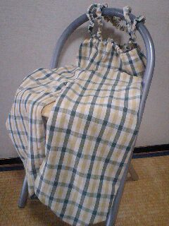 幼稚園ではお砂場遊びも大好きな次男。でも自力で立てないからベッタリ座るしかないわけで・・・公園などではシートを敷いたり、そのまんま座らせたりしてますが、この際なので幼稚園用のお砂場ズボンを作りました。GW明けから愛用してます。この写真じゃわかりにくいかな?どっかで見たサロペット風のお砂場ズボンが使いやすそうだったので、それっぽくしてみました。ただ大きな特徴としては足が出るところがないこと。歩かないし、ベッタリ座ったり、はい回ったりするからこの方が砂が入らなくていいのです。つりひもはゴムを入れて、なんとなくシャーリングっぽくしてみました。 こんな感じで使ってます。屋内に入るときはコレを脱がせて払っておけばいいので、介助する方もちょっと楽です。自分で脱ぎ着出来ればいいんだけど、今の次男には自力でズボンをはいたり脱いだりするのは難しいみたいです。あと、夏は暑いかな?そしたらお砂場遊びのたびにズボンお着替えでいいか。