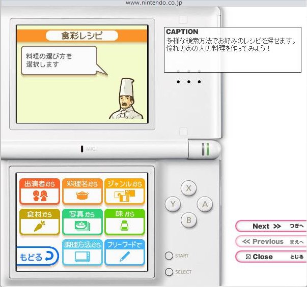 豊富な料理データと簡単解説で憧れの「あの人の味」を手軽に家庭で再現さまざまな分野で活躍されている著名人・有名料理人の思い入れレシピ199人200レシピを収録!赤井英和、秋元康、東ちづる、井川遥、石川さゆり、内舘牧子、江守徹、小川直也、桂三枝、工藤夕貴、熊谷喜八、紺野美紗子、西城秀樹、佐伯チズ、坂井宏行、佐藤弘道、春風亭昇太、林家正蔵、舞の海秀平、三國清三、道場六三郎、宮本亜門、山本耕史、脇屋友詞・・・あす楽 食彩浪漫 家庭でできる!著名人・有名料理人のオリジナルレシピDSソフト プレゼント