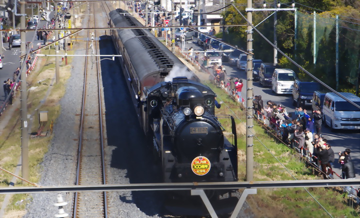 千葉から出発して木更津まで走る特別列車が13時頃、近くの駅を通過するというのでカメラ持って見物に行きました。線路の両側は見物客でいっぱい。普段あまり客の入らないコンビニの駐車場も満車。客車が6両つながって、切符は発売と同時に売り切れだったそうです。市街地のなかなので、線路をまたぐ陸橋から写真を撮ってみましたが、見えてから通過するまで数分。いい写真は撮れません。60年前だったら振り向きもされなかった蒸気機関車。ぴかぴかに磨かれて華やかでした。