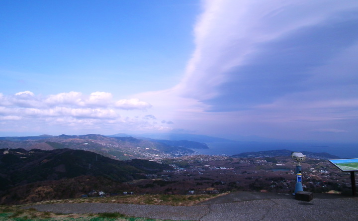 車がないので10分かけて近くのバス停まで歩きました。1時間に1本、9時55分の大室山経由伊豆高原行きのバスを待ってたら、軽乗用車が止まって、運転席からサングラス、上下ジーンズのどう見てもお爺さんが「どこまで行くの?乗ってきなよ」と声をかけてきました。躊躇しましたが、乗せてもらって、伊豆高原近く、国道沿いの売店に連れていかれました。「気に入らなかったら買わなくていいよ」でも買わないわけにはいかないでしょう。金目鯛とアジの干物を買って(値段は普通)、大室山まで送ってもらって別れました。天気は下り坂、風が冷たく、山頂は風が強くなってきました。山を下りてバスで伊豆高原駅まで出ました。普段車で通過してるので全く知らなかった伊豆高原駅の周辺は綺麗に整備されて桜祭りでにぎわってました(続く)。