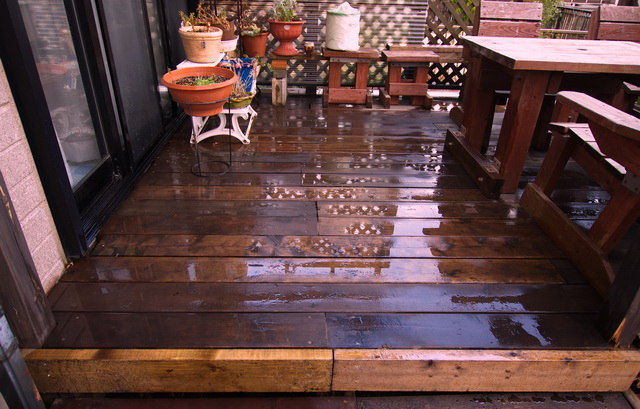 やっと雨が止んで久しぶりの青空が見える暖かな一日でした。カミサンは朝早いバスで友人と東京・横浜方面へ日帰りバスツアー。久しぶりの一人の日曜日は持ち越しになっていたウッドデッキの補修をしました。11時から4時間かけて腐った床板、土台、側板を交換しました。10年もたって全体が痛んでいるのを騙し騙し補修しながら使ってますが何時までもつやら、少なくとも今年の初夏のバーベキューは大人10人乗ってもなんとかなりそうです。近所の大型ホームセンター(18時)