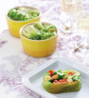 [ル・クルーゼ公式] 野菜とサーモンのテリーヌ料理名:野菜とサーモンのテリーヌ作者: ル・クルーゼ公式ショップ■材料(2人分)サーモン(刺身用) / 60gオクラ / 6本ズッキーニ / 1/2本赤パプリカ / 1/2個ヤングコーン(水煮) / 6本レタス(葉の大きいもの) / 2枚(A) / ・水 / 130ml・白ワイン / 小さじ2・タイム / 1/2本・コンソメ(顆粒) / 小さじ1・塩 / 小さじ1/4・ こしょう / 少々板ゼラチン / 3g■レシピを考えた人のコメント食感のよい季節の野菜をジュレと一緒にレタスで包みました。前菜にぴったりの、彩りも美しいさっぱりとしたテリーヌです。詳細を楽天レシピで見る→