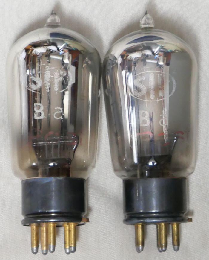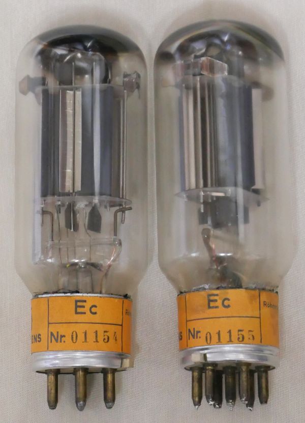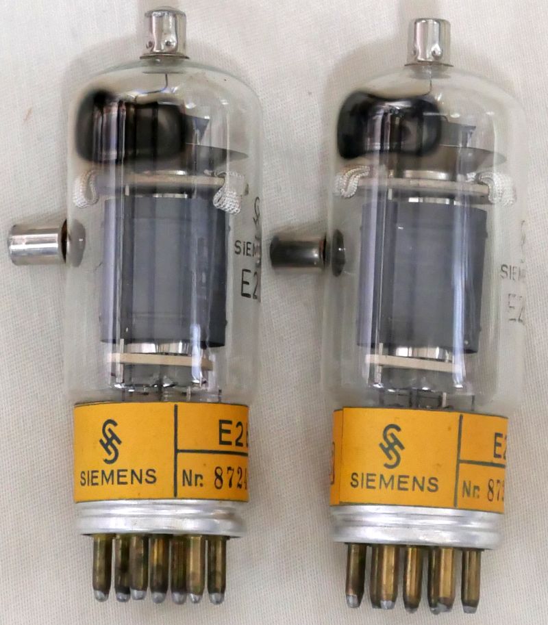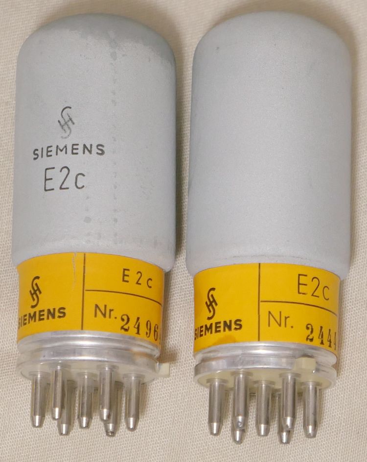 SIEMENSのE2dという真空管を紹介します。前回は寸胴の新型でしたが、今回はST型の旧型です。表にSIEMENSのマークとE2dの印字。裏側は、R.L.M、Eigentum、BA、11370、そして製造番号の印字がうっすら見えます。etracerで特性を測定しましょう。【1本目】Eh=4.0V, Ih=1.51A三極管接続Ep=220VEg1=-7.3VIp+Ig2=34.30mAIg2=4.49mArp=2222Ωgm=7909μSμ=17.6V/V五極菅接続Ep=220VEg2=180VEg1=-4.6VIp=34.46mAIg2=4.64mArp=40044Ωgm=8613μSμ=344.9V/V【2本目】Eh=4.0V, Ih=1.47A三極管接続Ep=220VEg1=-7.5VIp+Ig2=34.47mAIg2=3.86mArp=2298Ωgm=6948μSμ=16.0V/V五極菅接続Ep=220VEg2=180VEg1=-4.6VIp=34.67mAIg2=3.89mArp=49433Ωgm=7993μSμ=395.1V/Vほぼ前回の新型と変わらない特性です。(直線性は悪い)まぁこういう真空管を買う人は「自分が持っていない球はとりあえず買っておく」タイプだと思うので、直線性が悪くてもいいんです。(笑)