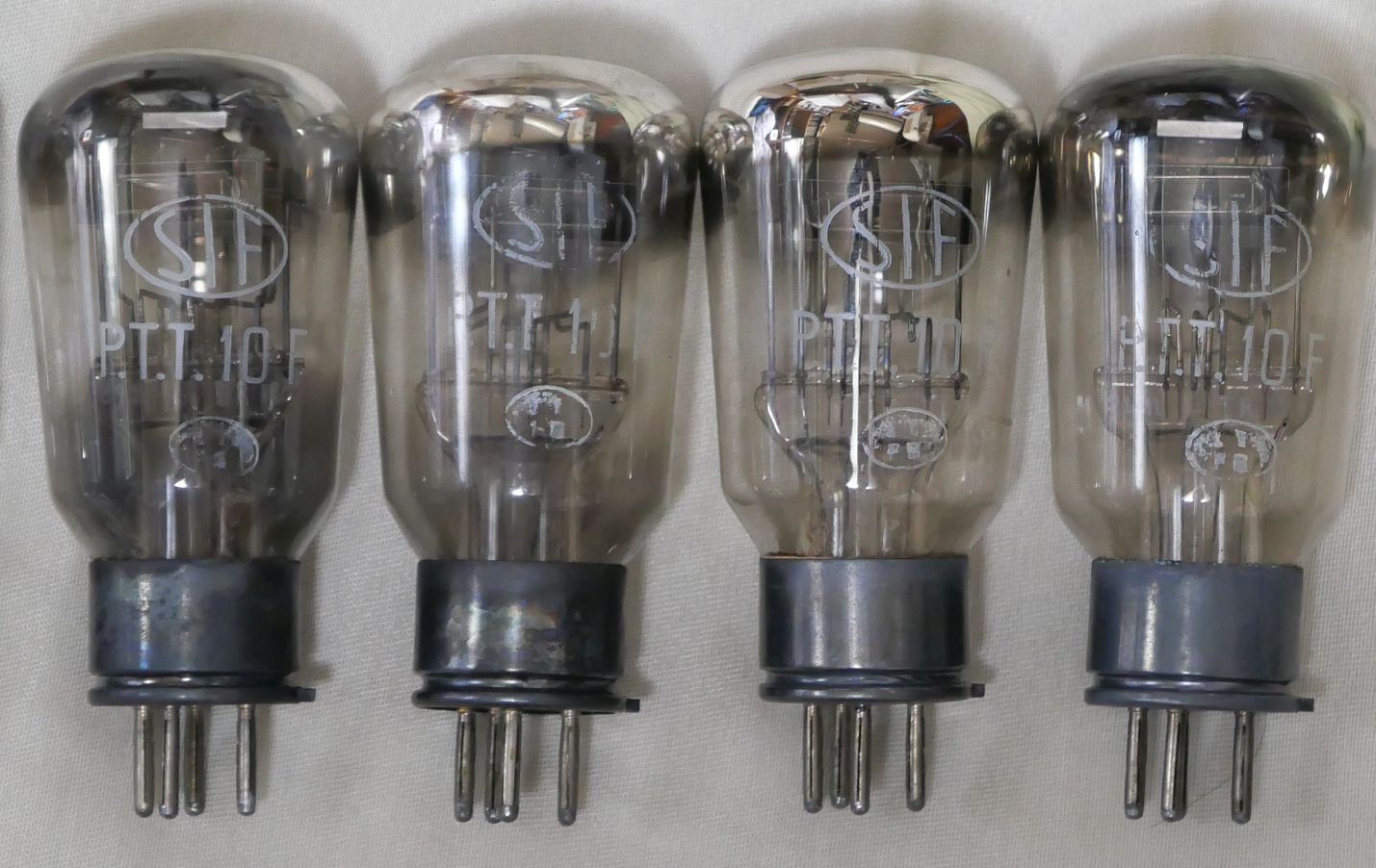 フランスSIFのPTT10Fという真空管を紹介します。水平に置かれたプレートが良いですね。フィラメントは2点吊りです。良い造りです。PTT10FはWestern Electric 101Dの同等管といわれています。ということは、Ef4.5VIf1Aですね。101Dの規格はFrankさんの資料室の「Western Electric 101D」規格表が参考になります。PTT10FはB4ベースでPTT10は101D同様のスモールUVですね。101Dに関してはUXベースの中国製もあるので、割と使いやすいかもしれません。しかしプレート損失は3W程度なので、まぁ0.3W出るかな程度です。でも93dBくらいのスピーカーで静かに聴くには0.3Wもあれば十分すぎる出力だと思います。etracerで特性を測定しましょう。【1本目】Ef=4.5V, If=1.00AEp=190VEg=18.0VIp=10.08mArp=5074Ωgm=1079μSμ=5.5V/V【2本目】Ef=4.5V, If=0.98AEp=190VEg=17.6VIp=10.03mArp=5284Ωgm=1044μSμ=5.5V/V【3本目】Ef=4.5V, If=0.99AEp=190VEg=17.4VIp=10.06mArp=5430Ωgm=1020μSμ=5.5V/V【4本目】Ef=4.5V, If=0.99AEp=190VEg=16.9VIp=9.82mArp=5340Ωgm=1069μSμ=5.7V/V出力はあまりとれませんが、魅力的な真空管だと思います。何よりもB4ソケットに挿せるのがよいですよね。