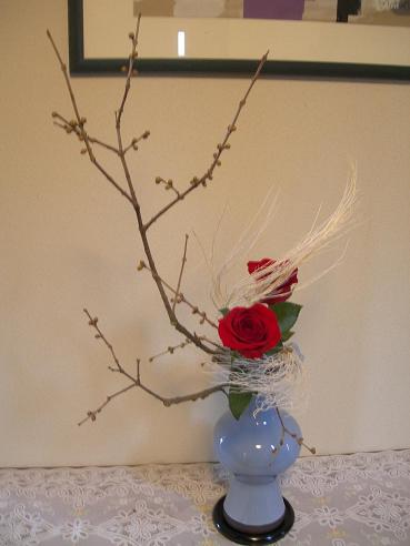 今日は、社中の先生がお二人我が家に来て今度の日曜日の研究会のお稽古をしました。お花屋さんの手違いで桐が瓶花にふさわしい長いものではなく、短いものが来てしまいこれではお稽古にならないとクレームを付けた所、今日は花市場が開かれる日ということで、もう一度探しに市場へ行ってくださいました。10時頃いらっしゃった2級の先生は最初は短い桐でお稽古をしていましたが、結局11時半に到着した長い桐でやり直しでした(><私は薔薇1本と2本と両方お稽古しました。客枝をドラセナでとって、薔薇1本です。薔薇2本の作品桐とのバランスもあるので、一概にいけませんが、薔薇2本の場合は、薔薇の葉とドラセナの色との融合がポイントのように思います。1本の時はやはり空間の生かし方が上手に出来ていれば良い点が期待できそうです。桐が無くてお花屋さんが本日の花卸市場に探しにいってくれたのですが、他に売るあてが無いということで大量の桐を卸値3000円で全部引き取りました。二人で使ってもこれだけ残りました。お社中の先生にはこの分のお金はいただかなかったので、3000円まるまる自己負担になってしまいました(><せっかく桐があるので、研究会が終わったら何かお稽古に使いたいと思います。1級の先生の課題石化柳 アカシア ピンクッションです。これは昨日私が親先生のところでお稽古してきたもの。あまり上手く生けられませんでした(><1級の先生の作品はとても綺麗でした。とくに石化柳が何とも言えない魅力的な作品でした。写真を取る時間が無く残念です。義妹は今回はお休みです。私は日曜日はおばあちゃまの納骨とお墓の魂入れなので、時間外で生けます。お花は最近不調ですが何とか頑張りたいと思います。