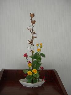 今日は二度目のクリスマス花材です。前回の白木とヒバと組み合わせて使える花材をお花屋さんと打ち合わせして、珍しい綿の木のお稽古となりました。生徒さんは綿の木を主枝に立てて、山帰来の実をそれぞれ工夫してたてるかたちで生けました。Uさんは、山帰来の実をバラしてバランス良く生けました。 Nさんは山帰来を1本のまま、綿の木にしばって使っています。実が左右バランス良く付いていたので、そのまま工夫して使いました。 Wさんは山帰来を後ろ側でアーチ状にして使っています。これも可愛かったです。私は集会所では生けずに指導のみ。家では、先日のならぶかたちに綿の木と山帰来の実だけ入れました。山帰来は水に付けなくても大丈夫なので、真ん中の上の実は巻きつけてあるだけです。スプレー薔薇が残ったので小品に生けました。先日の桐とドラセナと合わせました。桜の皮の樺細工の花瓶です。おばあちゃまは床の間を使っていなかったのですが、私は一応お花を生けられるようにしてみました。まだいろいろ物置になっています。もう少し片付けたいところですが、盾はおじいちゃまの俳句の入賞やらのもので、ここに置くことを希望されているので多分しばらくはこのままですね。