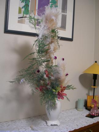 クリスマス花材で面白い作品を生けました。パンパスグラスにアスパラガスを巻き付けています。パンパスグラスも1本を二つに分けて使いました。高級な蘭の花バンダが3本も入っています。千日紅はツリーのライトが光っているイメージです。雪冠杉とバンダもクリスマスを演出しています。アイデイアは親先生です。雪が積もっているイメージでパンパスグラスを注文されたのかな?とても面白い作品になりました。後ろにバンダが二本入っているので、横から見ても綺麗です。 明日は伝統文化子供教室です。明日は責任者の方がお休みで私が代わりを務めます(^^;慣れていないのでちょっと心配です。この教室も政府の事業仕訳の対象となり、予算が大分減らされて、今までの形態ではなくなるようです。来年の2月の終了までしっかり子供たちに生け花の楽しさなどを伝えられると良いな。