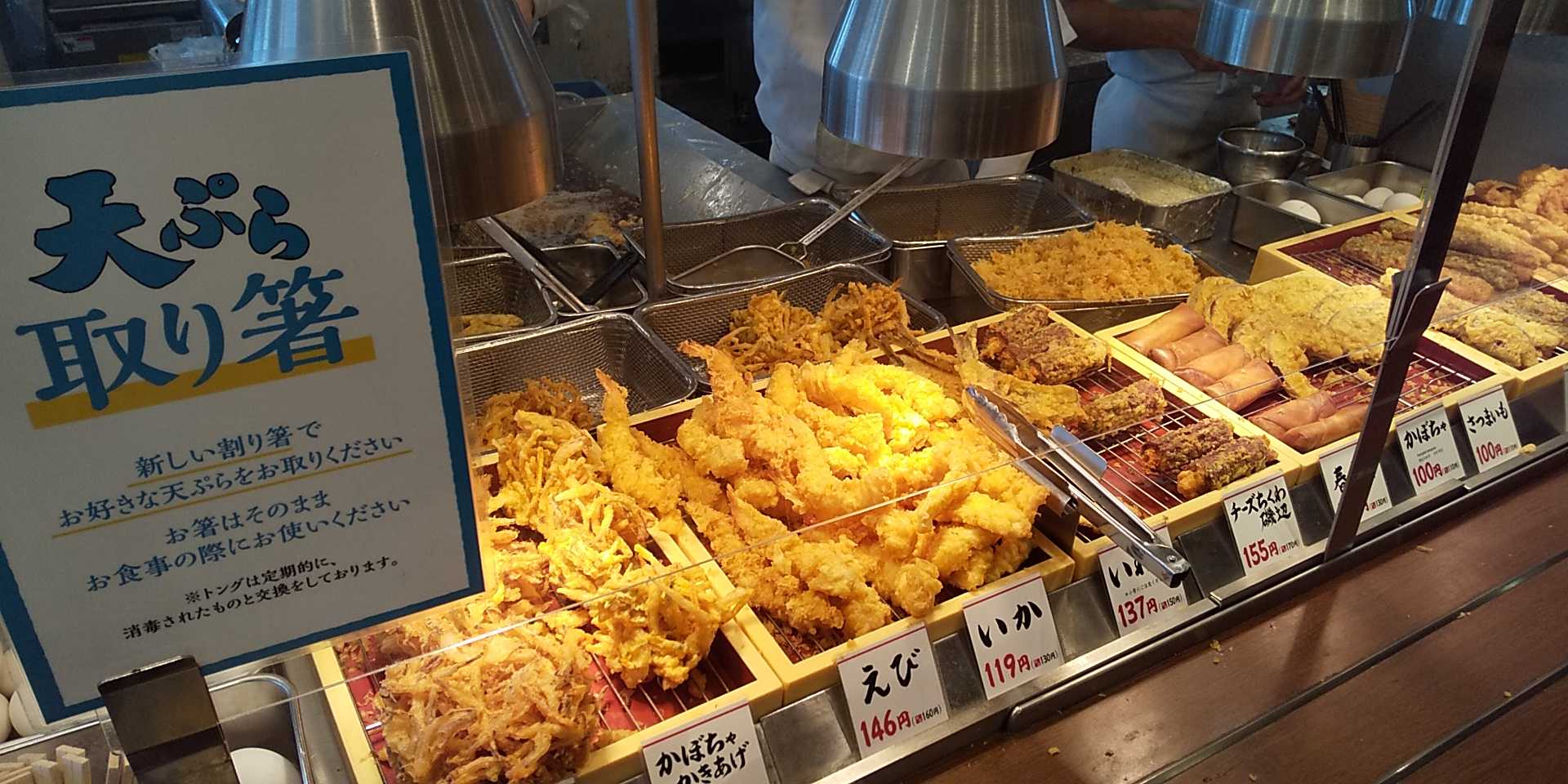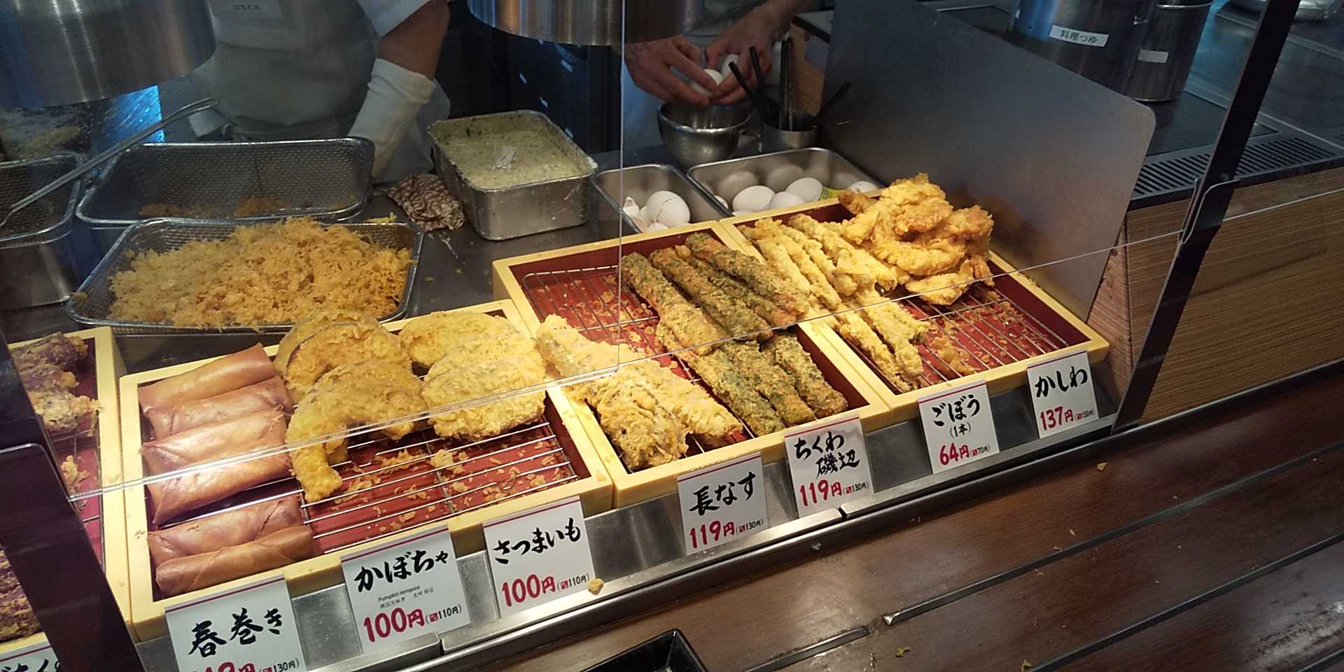 うどんの種類に量に冷温をセレクト、麺を受け取ったら天ぷらなどのトッピング類やらおむすびをお盆乗せましてお会計です