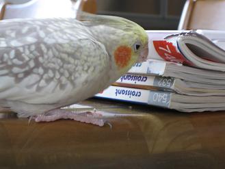 インコちゃんは齧るのが大好きなのはよく分かっているのですが。 『かじかじ』 どうしてママの愛読書を齧るのですか 『ニコッ』 可愛いので、許す 本当は片付けなかった私が悪いのです。るうは良い子だもんね~。