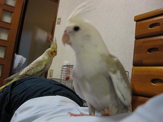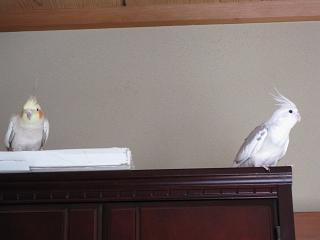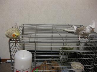 最近の二羽の様子はこんな感じです。あいかわらず、よそよそしい・・・るうるうがかいちゃんを寄せ付けません。困ったものだなあ(ーー;)『えへっ、私が一番~~~』