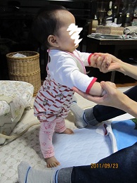 両手両足を床につけて、おしりをたかーく持ち上げるポーズを繰り返す娘。ふと、立ちたいんじゃないかしら?と思った。ハイハイの状態の時、手を持ってあげたら・・・すんなりと立った!!んもう、びっくりして叫びましたよ本人は誇らしげにニッコリしていました。嬉しかったのかな。ママも嬉しいよ でも早すぎないか~い?