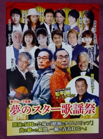 チケットがお安く(3000円)手に入り・・・その手に乗ってしまい・・・「夢のスター歌謡祭」へ行ってきました。出演者は、 黒沢年雄/加橋かつみ/ロザンナ/ビリー・バンバン/平浩二/チェリッシュ/狩人/桑江知子/石井明美/保科有里/ZERO、 ゲスト出演・松平健の12組です。オープニングは、松平健、ビリーバンバン以外の10組の出演者がステージ上に勢揃いしてご挨拶です。そして、トップバッターはチェリッシュのお二人。2014年11月の「同窓会コンサート」以来です。歌うは「てんとう虫のサンバ」、息の合った歌声を聴かせてくれました。♪~あなたと私が夢の国 森の小さな教会で 結婚式をあげました 照れてるあなたに 虫たちが くちづけせよと はやしたて そっとあなたは くれました~♪。まだまだ若々しい悦っちゃんと、ダンディな松崎さん。今話題のあのCM、大人の・・・のお話もあり、会場を沸かせてくれました。前回は、悦っちゃんが「・・・山あり、谷あり・谷あり・谷あり・・ですから」と話されましたが、今回は「長い間一緒にいると、空気のようで、時には息苦しい・・」と。(笑) 【今日のLifeHack:恋が入ってくると、知恵が出ていく。 ローガウ】