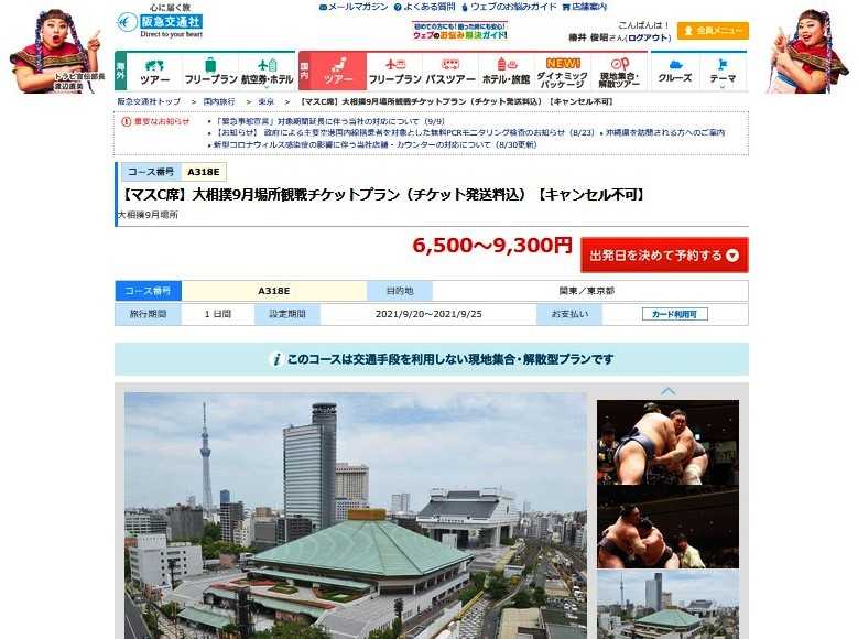・・・今回も日経新聞で見つけたツアーです。今年1月24日の初場所千秋楽に続いて2度目の大相撲観戦、「大相撲九月場所14日目」を観戦です。今場所は、私が応援する宮城野部屋の白鵬関と炎鵬関がコロナの濃厚接触者で休場、残念です。昨年・一昨年、数回お話した阿武咲関と東龍関に期待、活躍が楽しみです。実は、お二人とも、お会いするまで知りませんでしたが・・・。(笑)初場所はコロナで14時開始でしたが、今回は10時から開場です。これまでにない位、早く館内に入ります。館内は、これまでに見たことが無いくらい閑散としていて、寂しい光景です。ゆっくりと館内を見学します。横綱になった照ノ富士のパネルも飾ってあります。そして我々の升席を探すと、初場所の時よりも中央寄りでよく見えます。さっ、はじまり、はじまり・・・。・・・・・・・・・・・・・・・・・・・・・・・・・・・・・・・・・・・・・・・・コース番号:A318E:【マスC席】大相撲9月場所観戦チケットプラン(チケット発送料込)【キャンセル不可】 9,300円<おすすめポイント>大相撲九月場所 両国国技館、4年半ぶり!令和初の新横綱が誕生! マスC席 (1階 13~15列目)◆◇◆◇ マス席とは?◆◇◆1マス(通常4名様定員※)1.3m四方を鉄パイプで囲んだ中に4枚の座布団を敷いたお座敷。1400年の歴史と伝統を誇る日本の国技「大相撲」。年に6回開催される本場所のうちのひとつ、9月場所をお楽しみいただけます。両国国技館を舞台に力士達の熱い取組をお楽しみください。通常1マス4名様でご利用のところ、今場所では、このマス席を2名様でゆったりご利用いただけます。(※奇数人数でのご参加の方はマス席が相席となる可能性がございます。予めご了承くださいませ。)・・・・・・・・・・・・・・・・・・・・・・・・・・・・・・・・・・・・・・・・【今日のLifeHack:我慢するより、その原因を解決せよ 小早川隆景】〈大相撲九月場所14日目の国技館〉〈いつもの場所で記念撮影〉〈午前中は、こんな感じ〉〈横綱・白鵬関と、炎鵬関は、休場〉〈73代横綱・照ノ富士のパネルが追加〉