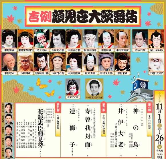 歌舞伎座の“お正月”は十一月、劇場正面破風の上に古式ゆかしく櫓が組まれます。もとは幕府公認の劇場を示すため、江戸三座のみが掲げることを許されたこの櫓は、現在では顔見世の象徴となっています。・・・2013年10月に孫姫が生まれ、お祝いに上京した母に歌舞伎を見せたのも11月、写真には櫓が映っていました。そして看板は、「吉例顔見世大歌舞伎」です。今回もJR東日本「大人の休日俱楽部」主催のイベントに参加です。1等席+アフタヌーンティーで17,400円が13,500円に割り引かれ、一等席のみ15,000円よりもお得です。3ヶ月ほど前の「八月花形歌舞伎」の時の一等席は14列目でしたが、今回は一等席1階席の前から8列目です。ラッキーです、舞台がよく見えます。・・・・・・・・・・・・・・・・・・・・・・・・・・・・・・・・・・・・・・・・<■「吉例顔見世大歌舞伎」>第1部は、水口一夫が作・演出を担う「神の鳥(こうのとり)」。兵庫・豊岡市の出石永楽館で2014年に初演された本作は、国の天然記念物で、兵庫県の県鳥でもあるコウノトリの親子を主人公にした舞踊劇。“歌舞伎座版”として上演される今回は、狂言師右近実はこうのとり(雄鳥)と山中鹿之介幸盛を片岡愛之助、狂言師左近実はこうのとり(雌鳥)を中村壱太郎が勤める。続く「井伊大老 千駄ヶ谷井伊家下屋敷」には、松本白鸚、中村歌六、市川高麗蔵、中村魁春が出演。劇中では、桜田門外の変で殺害された井伊直弼の暗殺前夜が描かれ、当代白鸚が、父・初世白鸚の当たり役だった井伊直弼を演じる。・・・・・・・・・・・・・・・・・・・・・・・・・・・・・・・・・・・・・・・・【今日のLifeHack:無為にだらしない生き方をするより真剣に生きるほうが、たとえ短命でも値打ちがあります。 瀬戸内寂聴】<吉例顔見世大歌舞伎><一等席、1階・・・初めての8列目><歌舞伎座の“お正月”は十一月、劇場正面破風の上に古式ゆかしく櫓が>