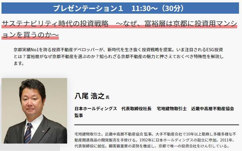「朝日不動産投資DAY」、ゲストの山田たかおさん、杉村太蔵さんの後は、「不動産投資」のトップランナーによるプレゼンテーションです。謳い文句は・・・ローン金利の低下や不動産価格の上昇を背景に、不動産投資への注目が高まっています。本イベントでは、投資不動産デベロッパーやファイナンシャルプランニングのプロなどが、最新の不動産投資について徹底解説。給与以外の副収入、また年金・相続対策など、不動産投資への理解を1日で深められるイベントです。気になった点を抜粋すると・・・・・・・・・・・・・・・・・・・・・・・・・・・・・・・・・・・・・・・・・・・プレゼンテーション①:「サステナビリティ時代の投資戦略 ~なぜ、富裕層は京都に投資用マンションを買うのか~」日本ホールディングス 代表取締役社長 八尾 浩之 氏・京都は景観条例が厳しく、マンションの高さは31m(最高10階)までの制限あり。高さ15mの5階建てが多い。・建物の色も規制があり、ローソンやマクドナルドも、街並みにあわせて、グレー系や透明などの外壁。・和風仕上げで、屋根に勾配が必要で、平らな屋上は出来ない。・半面、空室リスクは少なく、家賃収入が維持できる。・・・・・・・・・・・・・・・・・・・・・・・・・・・・・・・・・・・・・・・・プレゼンテーション②:「お客様の為のファイナンシャルプランニング」センチュリー21レイシャス 代表取締役 住吉 秀一 氏・社長は自宅の他に、5つの物件を持ったいる。仕事を辞める迄に何件増やせるかが勝負。・不動産の資産評価がは現金の1/3で済むので、相続にも有利。資産1億円が3000万円の評価。・今後必要な資金は、夫婦二人で月35万円。年で420万円、20年で8400万円。年金では心もとない。・2015年からマンションの空室率が急上昇している。・都市の総合力ランキングは、1位ロンドン、2位ニューヨーク、3位は東京。・利回りよりも都市部を選ぶのが賢明。・・・・・・・・・・・・・・・・・・・・・・・・・・・・・・・・・・・・・・・・【今日のLifeHack:大きな過ちを多く犯さないうちは、どんな人間でも偉人や善人にはなれない ウィリアム・グラッドストン】