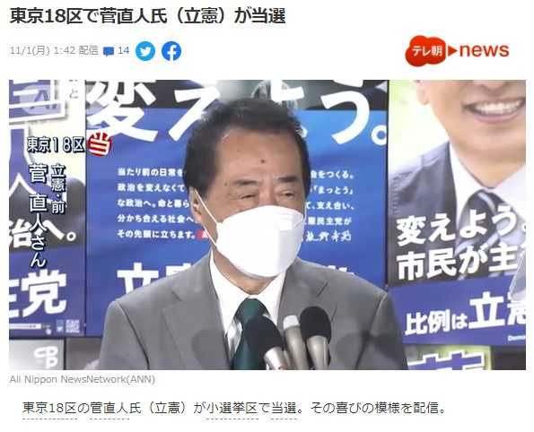 昨日、衆議院選挙東京18区で、菅直人元首相(立憲)が当選したとのニュースが流れました。かつて民主党に所属した、長島昭久元防衛副大臣が2019年に自民党入りし、長年の地盤だった東京21区から18区に国替えとなり、民主党政権をともに支えた2人による「旧民主対決」、事実上の一騎打ちとして注目を集めましたが、見事当選です。おめでとうございます。今後の益々のご活躍を期待しております。FM ilovecb2008年5月5日、首相になる前の菅直人さんとお話することができ、ツーショットも実現したのを思い出します。・・・・・・・・・・・・・・・・・・・・・・・・・・・・・・・・・・・・・・・・<略歴>1946年山口県生まれ。弁理士を経て80年衆議院議員に初当選し、当選13回。厚生大臣を経て96年に旧民主党を結党、代表を務める。副総理、財務大臣を経て、2010年第94代内閣総理大臣に就任。東日本大震災、東京電力福島第一原発事故対応の陣頭指揮にあたる。2017年に立憲民主党の結党に参画し、現在、党最高顧問。・・・・・・・・・・・・・・・・・・・・・・・・・・・・・・・・・・・・・・・・【今日のLifeHack:自分との戦いこそが明暗を分ける 王貞治】<菅直人元首相、当選!><2008年5月5日、首相になる前の菅直人さんとお話できツーショットも実現>
