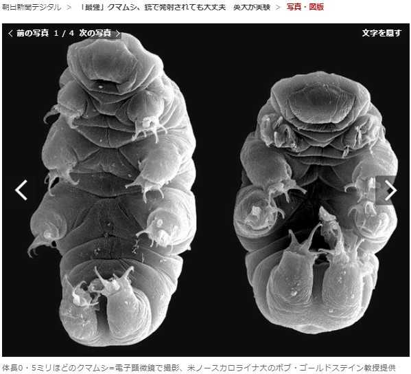 今朝の日経新聞「春秋」に、近ごろ話題になっている最強の生物、「クマムシ」の話が載っていました。体長1ミリ以下の微生物ながら100度の高温でも極低温でも生存し、人間なら即死する放射線量や水深1万メートル級の高圧でも平気、あまりの強靱ぶりに、隕石に乗ってやってきた地球外生命との説「パンスペルミア説」があり、惑星とぶつかる衝撃にも耐えられるかどうか、英国ではクマムシを銃の弾丸に詰めて発射した研究者まで現れたといいます。こんな驚異の生命体を知れば、人類が永久に種の頂点に立つと思うのは間違いだと実感する。温暖化で生態系が一変しても、クマムシのように逞(たくま)しい生物がまた、新たな生態系を築くだろう。人類がいなくてもこの青い星は回り続ける、とも。だから地球環境を守るのは、ひとえに人類が生き延びるため、一丸となれば確実にこの惑星を救う力があると、動物学者、デイビッド・アッテンボロー卿が国連の温暖化会議で弁舌を振るった、といいます。残り時間を無駄にはできない。さて、これからの時季にピッタリの歌が、クマムシの「あったかいんだからぁ♪」です。2015年、クマムシのお二人との握手・スリーショットを思い出しながら・・・地球環境を考えましょう。・・・・・・・・・・・・・・・・・・・・・・・・・・・・・・・・・・・・・・・・<過去ブログ>April 19, 2015 ★クマムシと握手、「あったかいんだからぁ♪」。今絶好調のお笑いコンビ・クマムシの無料コンサートへ行ってきました。デビューシングル「あったかいんだからぁ♪」(2/4発売)が、先月末付オリコン週間カラオケランキング(集計期間:3/16~3/22)で初の首位を獲得、芸人の同ランキング首位は異例で1997/3/17付の猿岩石「白い雲のように」以来18年ぶり。佐藤大樹さんと長谷川俊輔さんの2人組で歌ネタ「あったかいんだからぁ♪」を楽曲化したもの、2010年にコンビを結成、ボケ役・長谷川俊輔さん(29)がクラブDJの経験を生かした歌ネタでブレーク。相方・佐藤大樹さん(27)と昨秋から♪あったかいんだからぁ♪のフレーズが流行し今年2月にCD化。10万枚を突破し、配信でも35万ダウンロードを記録する大ヒットに・・・。♪~特別なスープをあなたにあげる あったかいんだからぁ♪瞳の中にある私の大きな野望 ワクワクのリズムみんなの笑顔が太陽みたいに あったかいんだからぁ♪いつまでもこのまま私を楽しませて コブ島ダイ子のかわいさあふれてYES とまらないんだからぁ♪いつまでもこのまま私を楽しませて お風呂上がりのアイスの最初の一口 あったかいんだからぁ♪英語版もあり・・・I’ll make a special soup for you, (特別なスープをあなたにあげる)Just for you baby, can’t you see (特別なスープをあなたにあげる)Attakaindakara (あったかいんだからぁ)I feel the special glow in my eyes Oh can’t you see my big ambition (瞳の中にある私の大きな野望)I hope your smile will always be Warm and bright like the shining sun (みんなの笑顔が太陽みたいに)Feel so warm inside u know (あったかいんだからぁ)I hope this moment lasts forever Oh baby please keep making me happy (いつまでもこのまま私を楽しませて) 芸を楽しみ、歌を楽しみ、握手・ツーショットを楽しんできました・・・。(笑)・・・・・・・・・・・・・・・・・・・・・・・・・・・・・・・・・・・・・・・・<■朝日新聞デジタル記事:「最強」クマムシ、銃で発射されても大丈夫 英大が実験>石倉徹也2021年6月19日> クマムシは体長0・1~1ミリほどの8本脚の動物。世界に約1200種いる。厳しい環境下に置かれても「乾眠」という仮死状態で生き続け、水に触れると「復活」する。冷凍で30年以上保存されていたコケの中から復活した例や、高山や極地、深海、放射線が飛び交う宇宙空間でも生き抜いた例がある。 マーク・バーチェル教授(宇宙科学)らは、凍らせて乾眠状態にしたクマムシ数匹をナイロン製の弾に詰めてガス銃で発射。数メートル先の砂に撃ち込まれた弾から取り出して水に浸したところ、ライフル銃並みの秒速825メートルまでの衝撃なら息を吹き返し、動き始めることを確かめた。 ただ、秒速900メートル以上の速さだと体がバラバラになり、一匹も生き延びることはできなかった。また、復活したクマムシも、通常の乾眠からだと水に浸して8~9時間で動き出すのに、今回は2~4倍の時間がかかったという。衝撃で内部が損傷を受けたとみられる。・・・・・・・・・・・・・・・・・・・・・・・・・・・・・・・・・・・・・・・・【今日のLifeHack:PKを外せるのはPKを蹴る勇気を持った者だけだ ロベルト・バッジョ】<最強の生物「クマムシ」><今朝の日経新聞「春秋」><歌手「クマムシ」><クマムシのお二人とツーショット>