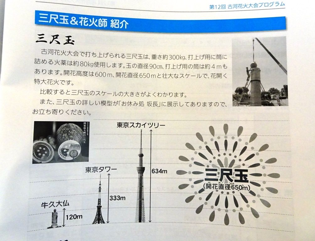 「古河花火大会」は数年前まで「関東最大の花火」と謳っていましたが、最近は最大級に変えたようです・・ご謙遜?。目玉は「三尺玉」、重さ約300Kg、直径90センチ、開花高度約600m、開花直径約650mで東京スカイツリーと同じ位。製作に約半年、高速道路を通れず新潟県加茂市から一般道路を運ぶそうです。