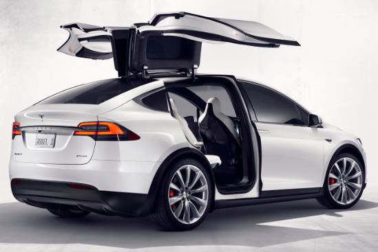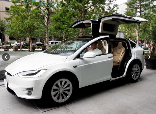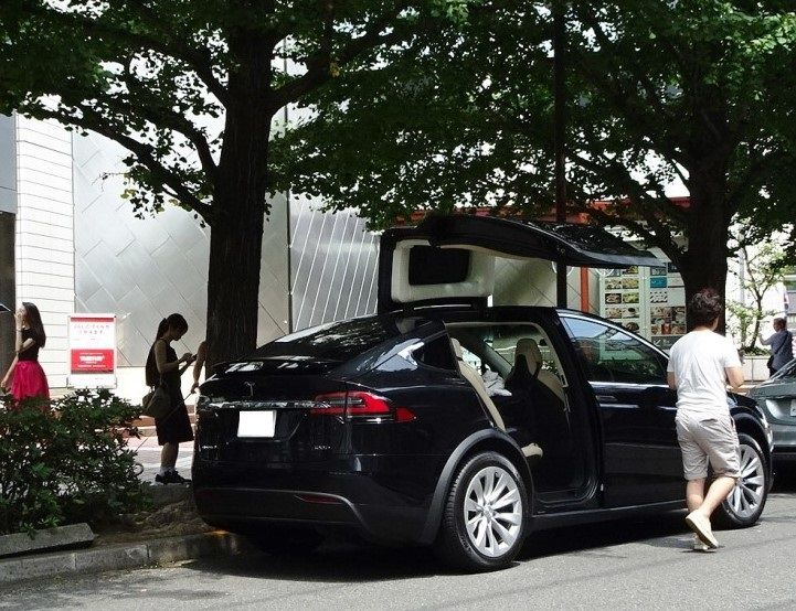クロスオーバー電気自動車「テスラ・モデルX」です、初めて見ました。