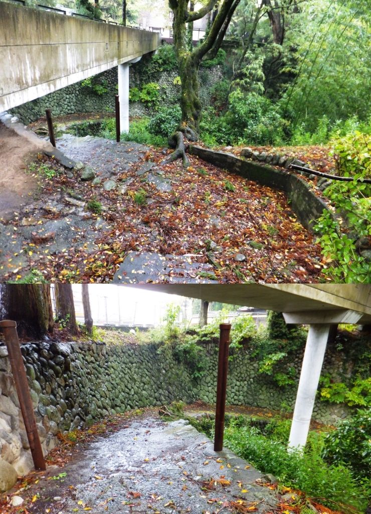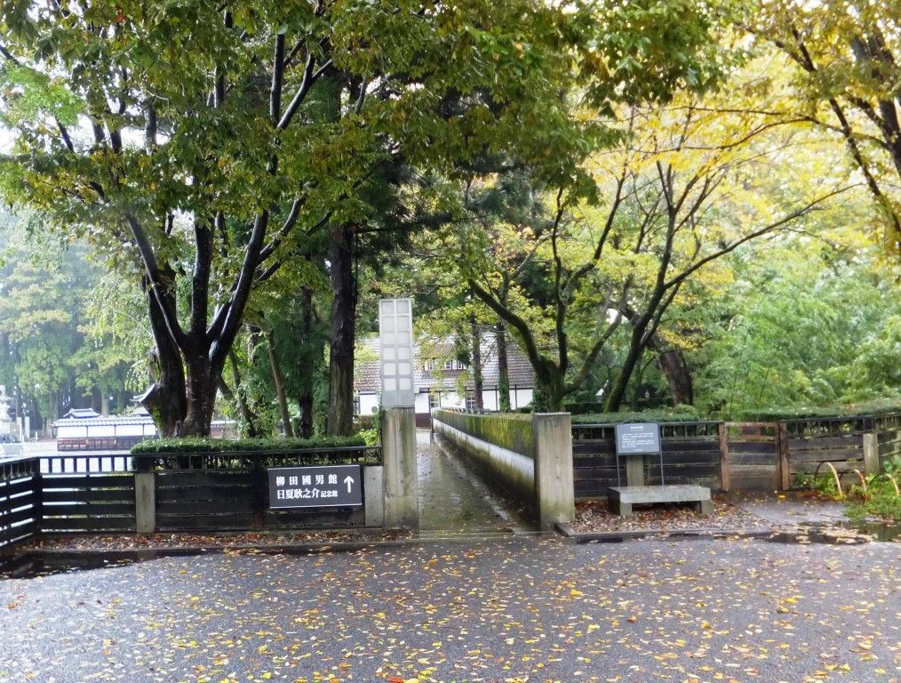 飯田市美術博物館の先には、柳田国男記念館と日夏耿之介(ひなつ こうのすけ)記念館があります。二つの記念館がある場所は、飯田城本丸跡で、通路の下には飯田城の堀の跡がるとのことで、友人が下まで下りて案内してくれました。