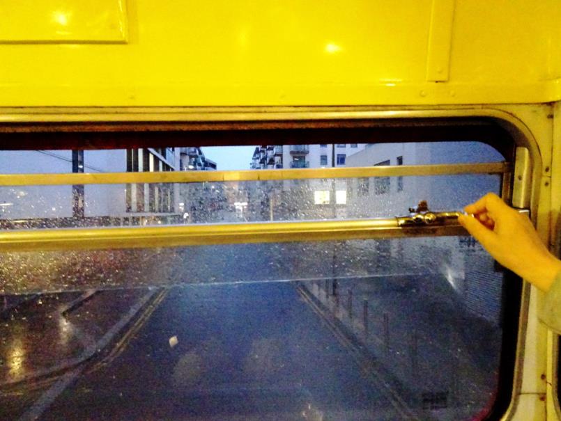 <折角の2階最前列ですが、外は雨、ワイパー無し!>