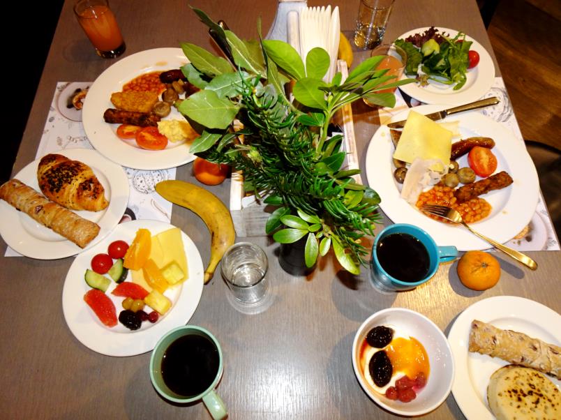 生野菜、煮豆、ベーコン、卵と品揃えは多く、十分です。