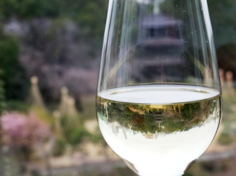 朝酒は・・・ご好意でアップグレードのガーデンビューの部屋から三重塔を眺めながらの一杯、白ワインです。