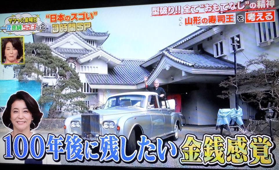 .山形・天童市へ角田が向かった。突如現れた巨大なお城、倉庫を案内してくれた”城主”の岡田茂さんはロールス・ロイスを見せてくれた。2階はお城のイメージとはかけ離れた洋風のリビングになっている。和の部屋もあり、家族写真などが飾られている。”城主”岡田茂さんの職業とは?.岡田さんは山形で40年以上続く”男寿し”を営む寿司職人。お城は自宅兼店舗で総工費は3億円だという。店内には高級車エクスキャリバーが置いてあり、カウンターや大広間、洋室など様々な部屋が完備されている。岡田さんは15歳から全国各地の寿司屋で修行を続け、19歳で開業。29歳で寿司屋を建て替え、高級車を購入。高級車を使った送迎やパレードなどが話題となり、お店は大繁盛。45歳でお城を建て、”城主”となった。