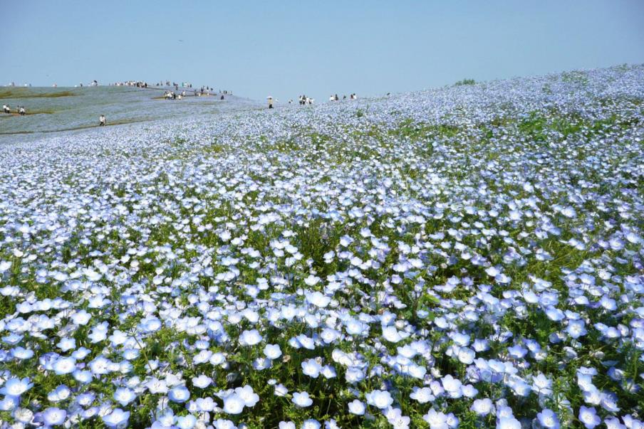 空の青とネモフィラの青が一体となり、広い丘一面に咲き乱れるその姿は見事です。