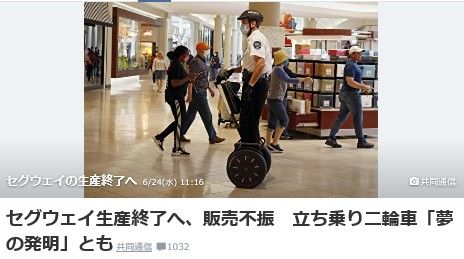 セグウェイ生産終了へ、販売不振 立ち乗り二輪車「夢の発明」とも   6/24(水) 11:12配信