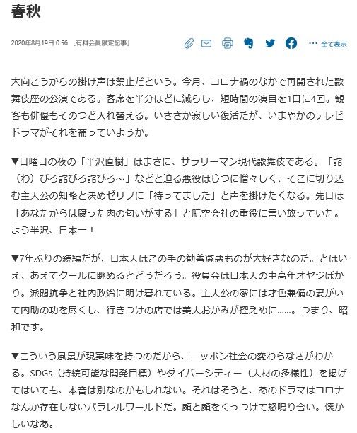 大向こうからの掛け声は禁止だという。今月、コロナ禍のなかで再開された歌舞伎座の公演である。客席を半分ほどに減らし、短時間の演目を1日に4回。観客も俳優もそのつど入れ替える。いささか寂しい復活だが、いまやかのテレビドラマがそれを補っていようか。 ▼日曜日の夜の「半沢直樹」はまさに、サラリーマン現代歌舞伎である。「詫(わ)びろ詫びろ詫びろ~」などと迫る悪役はじつに憎々しく、そこに切り込む主人公の知略と決めゼリフに「待ってました」と声を掛けたくなる。先日は「あなたからは腐った肉の匂いがする」と航空会社の重役に言い放っていた。よう半沢、日本一! ▼7年ぶりの続編だが、日本人はこの手の勧善懲悪ものが大好きなのだ。とはいえ、あえてクールに眺めるとどうだろう。役員会は日本人の中高年オヤジばかり。派閥抗争と社内政治に明け暮れている。主人公の家には才色兼備の妻がいて内助の功を尽くし、行きつけの店では美人おかみが控えめに……。つまり、昭和です。 ▼こういう風景が現実味を持つのだから、ニッポン社会の変わらなさがわかる。SDGs(持続可能な開発目標)やダイバーシティー(人材の多様性)を掲げてはいても、本音は別なのかもしれない。それはそうと、あのドラマはコロナなんか存在しないパラレルワールドだ。顔と顔をくっつけて怒鳴り合い。懐かしいなあ。