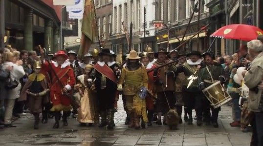 今もレンブラントにちなんだ記念日やイースター祭に合わせて、市民たちが《夜警》に描かれている登場人物の姿に仮装して、街を練り歩くイベントが行われています。