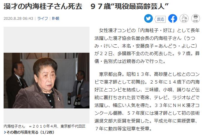 <女性漫才師の第一人者、内海桂子さん(97)死去> 8/28(金)