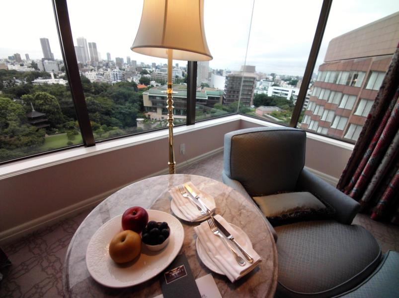 <アップグレードで、14階ガーデンビューのお部屋、テーブルにフルーツも・・・>