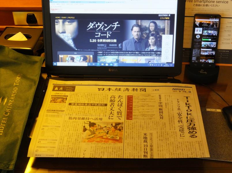 部屋に入ると、いつもの様にテーブルには果物が、机にはパソコンと自由に使えるスマホも用意されていて、夕方と翌朝には日経新聞も届きます。