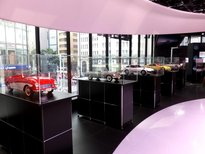 そして館内アナウンスに誘われて二階に上がると、歴代フェアレディのスケールモデルが並んでいます。