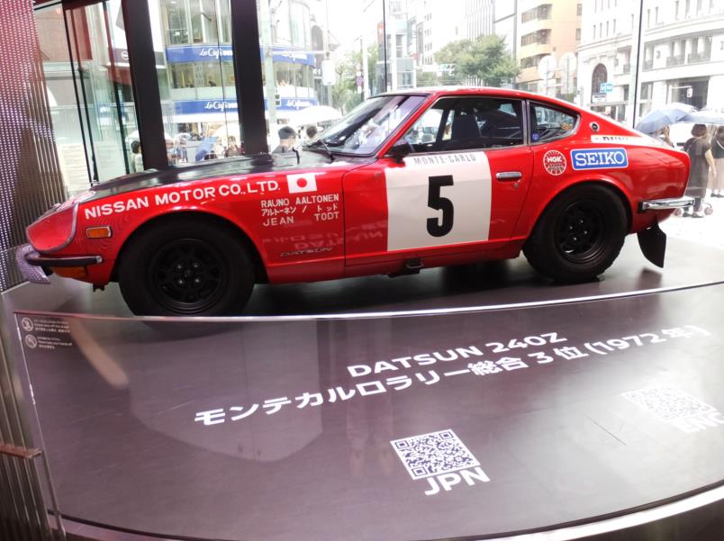 ショールームのコーナーに、1972年の「コンテカルロラリー」で総合3位を獲得した「DATSUN 240Z」が展示してあります。