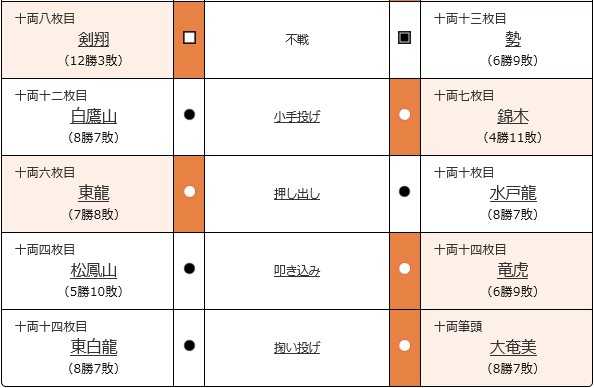 因みに、幕下:西幕下十九枚目魁(さきがけ)、三段目:東三段目五十四枚目小城ノ浜(おぎのはま)、序二段:東序二段十五枚目野上(のがみ)、序ノ口:東序ノ口二十五枚目熱海富士(あたみふじ)、です。