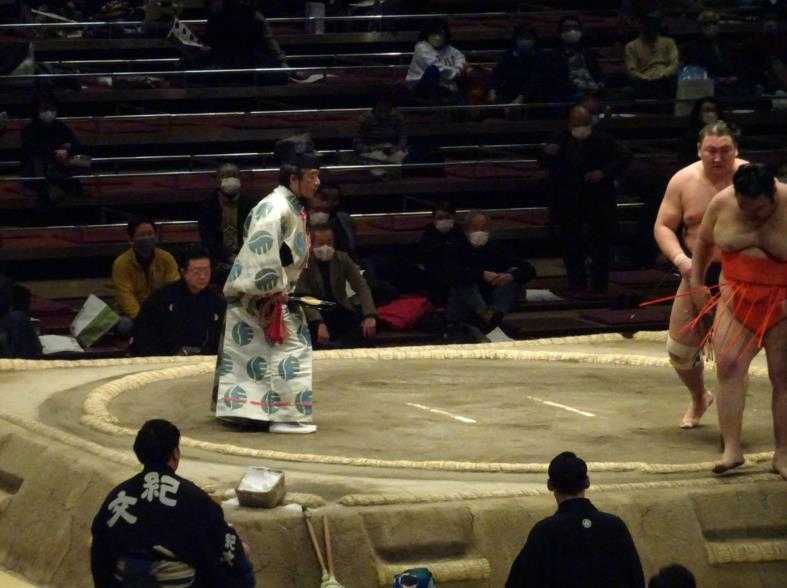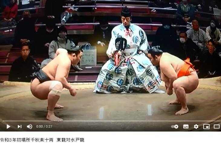 御挨拶後、十両戦の再開、東十両六枚目の「東龍関」、押し出しで、西十両十枚目の「水戸龍関」を破りました。