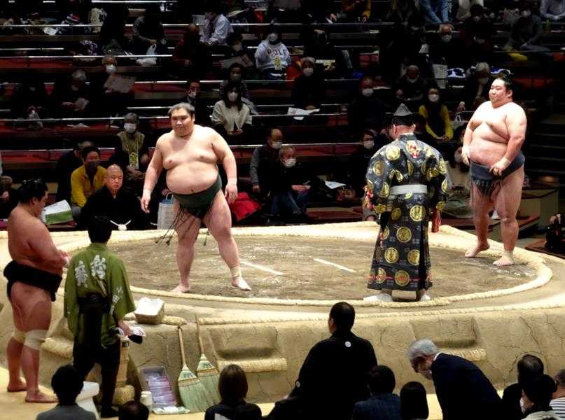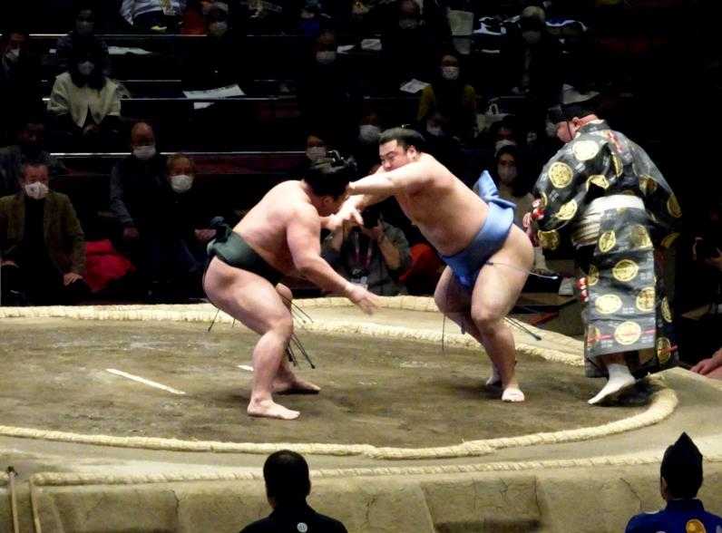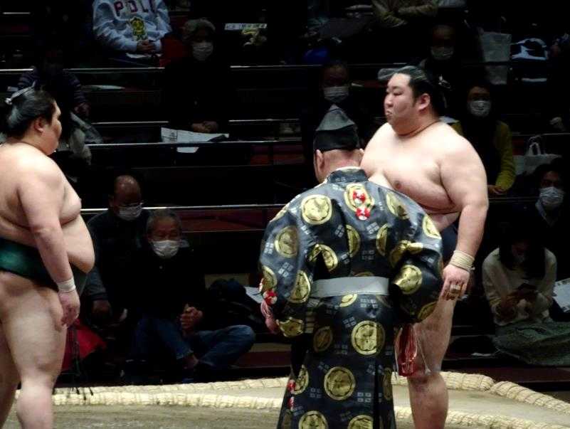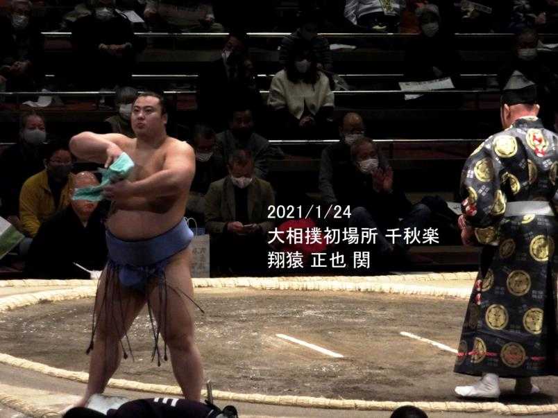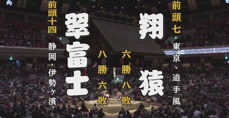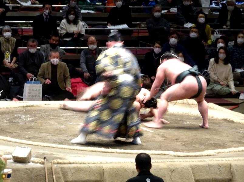 翠富士(みどりふじ)関が肩透かしで、翔猿関を破りました。