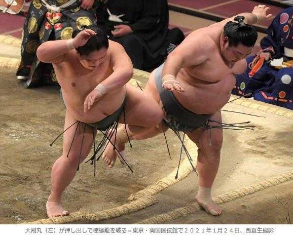 大翔丸関が押し出しで、徳勝龍関を破りました。