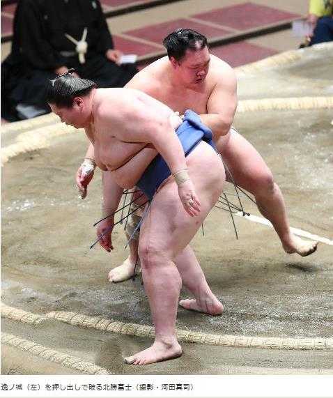北勝富士関が押し出しで、逸ノ城関を破りました。